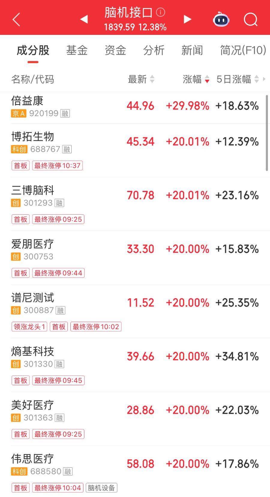 1月5日,2026年A股市场开盘首日,脑机接口概念股集体狂欢,指数盘中大涨超12%。个股方面配资平台网,倍益康(920199.BJ)30cm涨停,博拓生物(688767.SH)、三博脑科(301293.SZ)、爱朋医疗(300753.SZ)、谱尼测试(300887.SZ)、熵基科技(301330.SZ)、美好医疗(301363.SZ)、伟思医疗(688580.SH)等11只概念股20cm涨停。